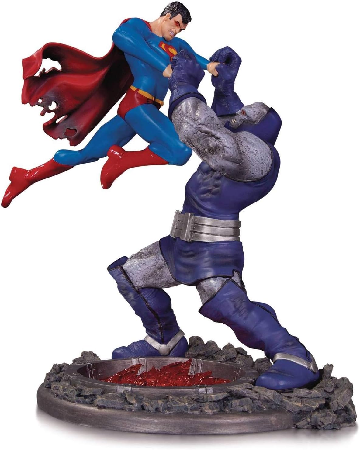Over a fire pit rages the bitter battle between the Man of steel and Darkseid, dread Lord of Apokolips. This popular statue is extending its run with this third edition, which features some brand-new paint decos. Limited to 5, 000 pieces and individually numbered. Statue measures approximately 12.4" Tall.